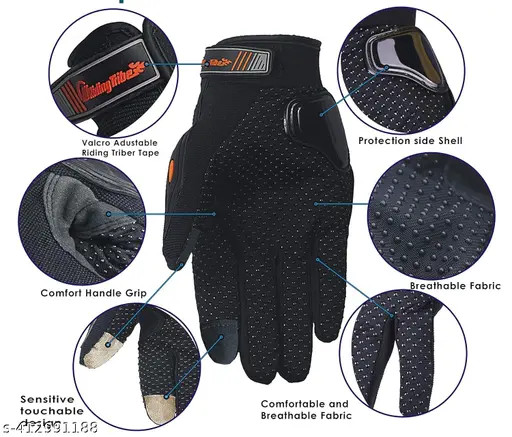 دستکش ها نیز مثل دیگر تجهیزات موتور سواری مهم هستند و برای چسبندگی دست به فرمان استفاده می شود و از عرق کردن و آسیب دیدگی در صورت بروز حادثه و دما بالا و پایین و.. جلوگیری می کند.دستکش موتور سواری انواع مختلفی دارد به طور مثال برای هوا گرم و تابستان از دستکش هایی که سبک و سوراخ دار هستند باید استفاده شود و در هوای سرد و زمستان از دستکش هایی که جنس مقاوم دارد، در دمای پایین دست ها بسیار زود سرد می شوند و دستکش باید با دست ها فیت باشد و قسمت کف دست باید جنسی مقاوم نسبت به سایدگی داشته باشد. دستکش چهارفصل RIDING TRIBE دارای قابلیت ضربه گیری در نواحی حساس دست و انگشتان و چسب تنظیم و قابلیت استفاده از تاچ موبایل میباشد.