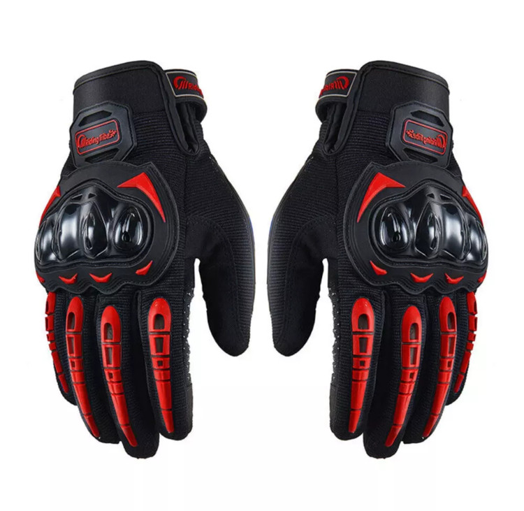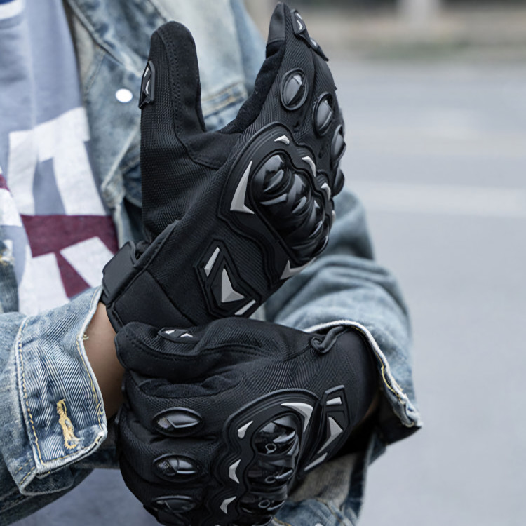 دستکش ها نیز مثل دیگر تجهیزات موتور سواری مهم هستند و برای چسبندگی دست به فرمان استفاده می شوند و از عرق کردن و آسیب دیدگی در صورت بروز حادثه جلوگیری می کنند.دستکش موتور سواری انواع مختلفی دارند به طور مثال برای هوا گرم و تابستان از دستکش هایی که سبک و سوراخ دار هستند باید استفاده شود و در هوای سرد و زمستان از دستکش هایی که جنس مقاوم در برابر بارندگی و سرما دارند. در دمای پایین دست ها بسیار زود سرد می شوند و میبایست از دستکشهای ضد آب مخصوص زمستان استفاده نمود. دستکش باید با دست ها فیت باشد و قسمت کف دست باید جنسی مقاوم نسبت به سایدگی داشته باشد. این دستکش بیشتر مناسب فصول بهار پاییز و تابستان می باشد.